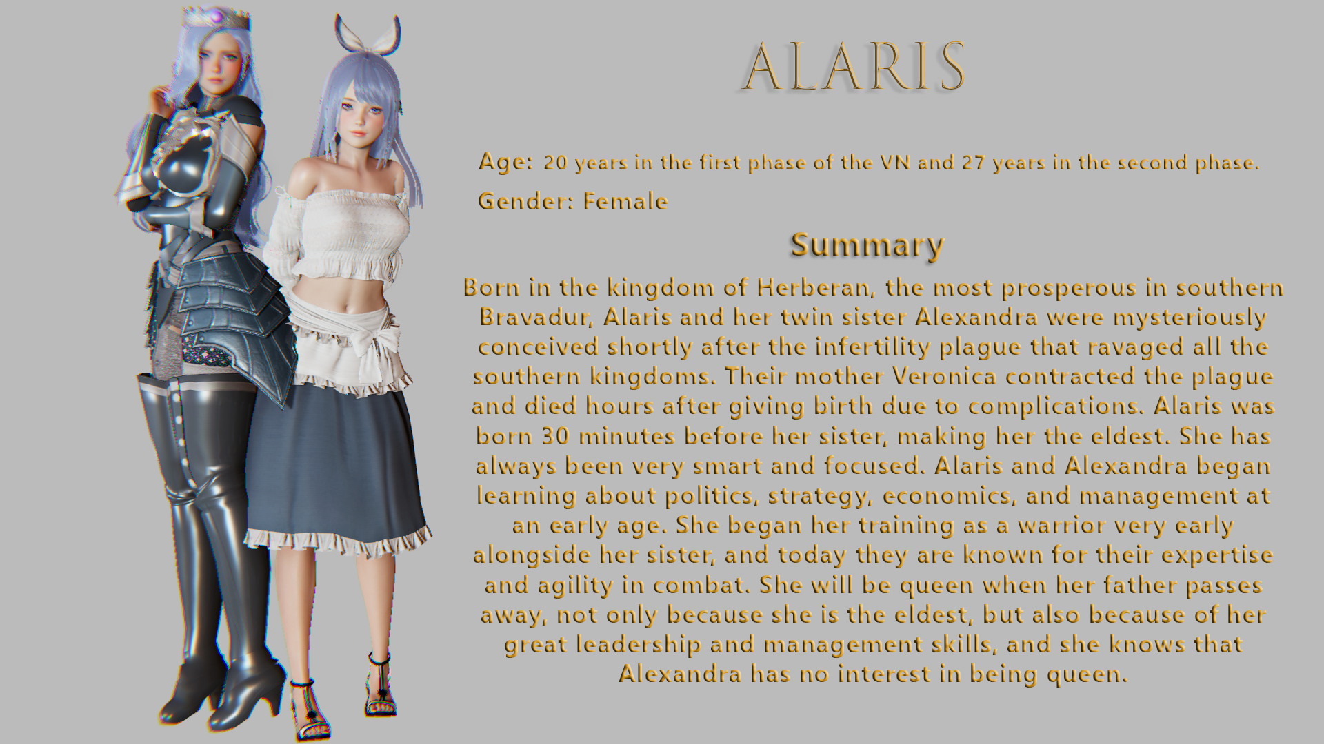 The images above show Alaris in the first and second phases of the VN. The other characters will undergo the same transformation, but that will be a surprise, so stay tuned! I will also insert scene replays and create a summary, as shown in the example image.